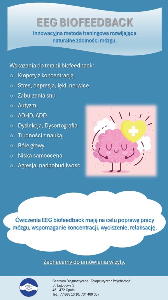 EEG Biofeedback lub neurofeedback, to nieinwazyjna i bezbolesna metoda treningu mózgu polegająca na świadomej regulacji jego aktywności poprzez sprzężenie zwrotne. Podczas sesji elektrody na skórze głowy rejestrują fale mózgowe, a specjalne oprogramowanie przekształca je w wizualne lub dźwiękowe informacje zwrotne. Pacjent uczy się modyfikować wzorce fal mózgowych, korzystając z plastyczności mózgu, co pozwala poprawić m.in. koncentrację, pamięć i zdolność do radzenia sobie ze stresem.